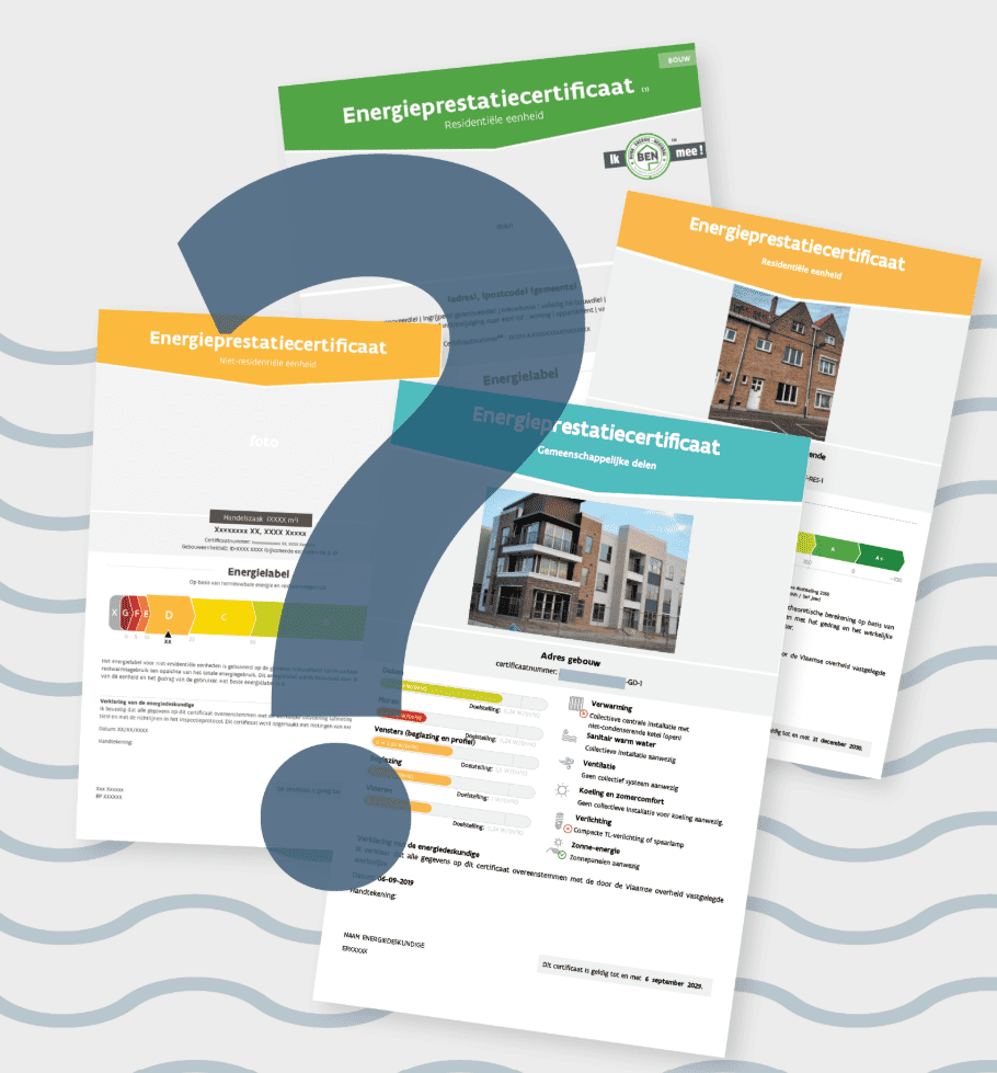 In Vlaanderen zijn er verschillende types van het energieprestatiecertificaat (EPC). Voor woningen en appartementen, maar ook voor de gemeenschappelijke delen van een appartementsgebouw en (kleine) niet-residentiƫle gebouwen.
